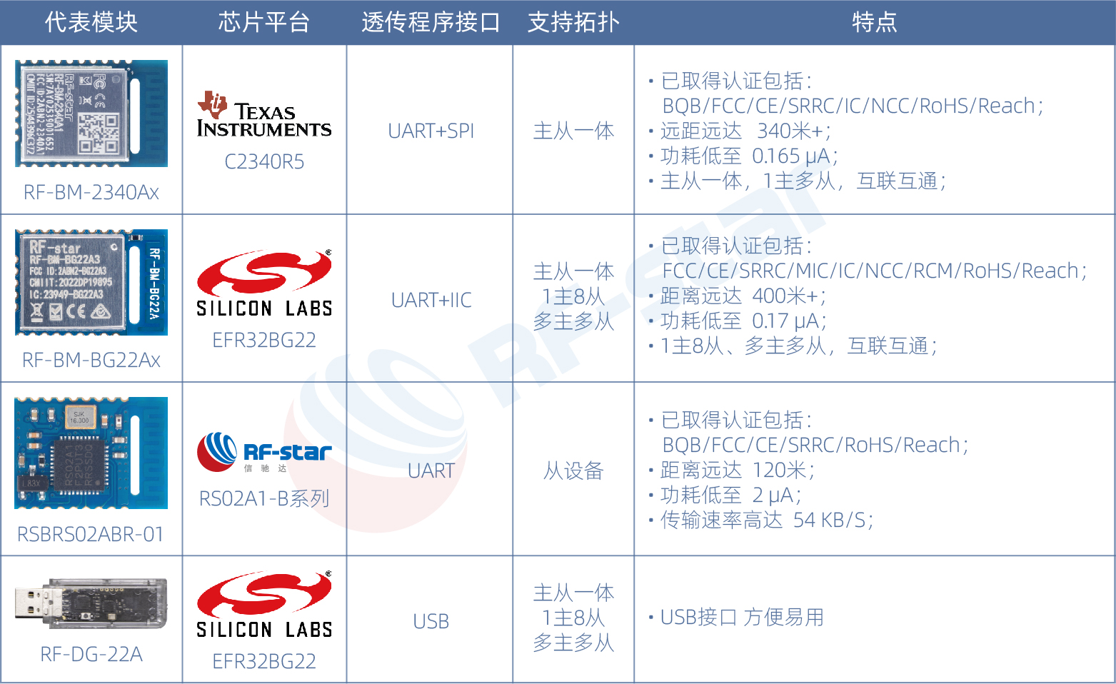 SPI/I2C Type: Differences in serial transmission rates, e.g., RF-BM-2340A2 supports SPI transparent transmission protocol, RF-BM-BG22Ax supports I2C transparent transmission protocol.