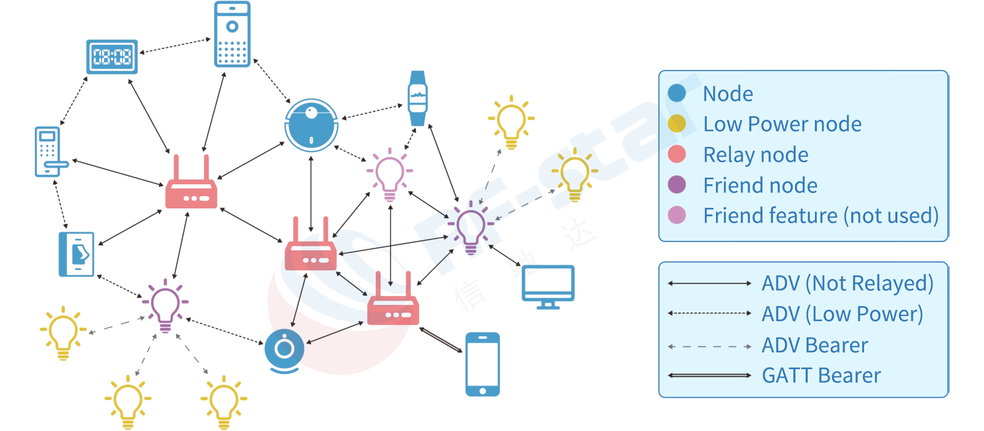 Bluetooth Mesh Networking One-to-Many: Employs a "flooding" network management approach. Each node that receives a message forwards it, relaying it via other nodes until the target node receives it. Theoretically, a network can accommodate tens of thousands of nodes, enabling many-to-many communication. However, the network is complex, and power consumption and latency are difficult to control.