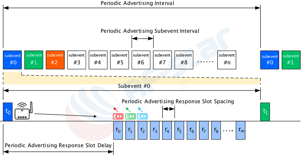1. Establish Synchronization: The Broadcaster continuously sends a periodic advertising stream containing specific timing information. Thousands of Subscriber devices listen to this advertising stream and maintain precise synchronization with the Broadcaster's timing. They know in which specific time window(s) they are assigned to communicate.
